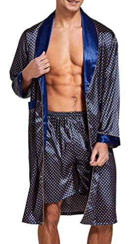 Lovasy Herr satängrock kimono morgonrock lätt silke långärmad badrock med bälte och fickor, BLÅ, S