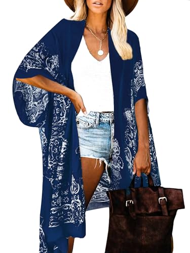 L-Peach Boho-kimono för kvinnor, lång cardigan, rymliga myskläder, överdimensionerad kaftan, strandklänning, täckande kläder, morgonrockar, E vit mörkblå, en storlek