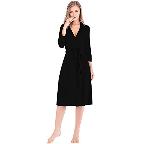 NY Threads damrock, lyxig lätt stickad kimono morgonrock för kvinnor, avslappnad lätt badrock för nattkläder och myskläder, Svart, M