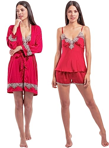 Laura Lily - 5 st dam nattlinne set satin pyjamas morgonrock kimono spets kort badrock rock pyjamas nattkläder klänning shorts och byxor underkläder spets. Vinröd, S