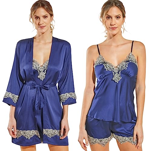 Laura Lily - 5 st dam nattlinne set satin pyjamas morgonrock kimono spets kort badrock rock pyjamas nattkläder klänning shorts och byxor underkläder spets. Blå, S
