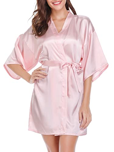 Vlazom Kimono för damer, morgonrock, kort satin badrock med bälte, v-ringad kimono, Ljusrosa, S