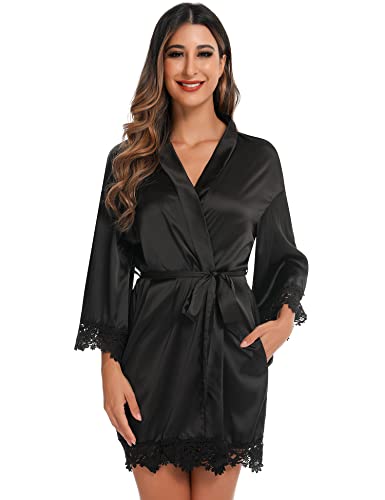 Vlazom Kimono för damer, morgonrock, kort satin badrock med bälte, v-ringad kimono, svart, S