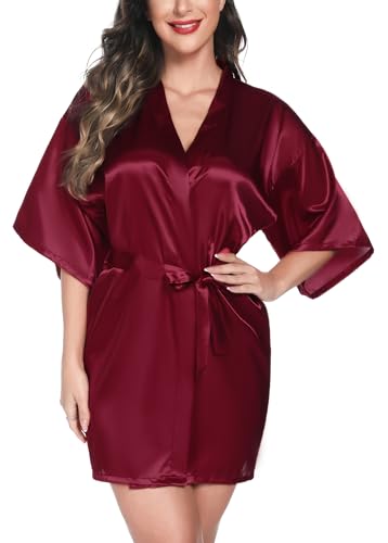 Vlazom Kimono för damer, morgonrock, kort satin badrock med bälte, v-ringad kimono, Fuchsie, S