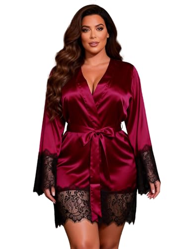 ohyeahlady morgonrock dam, kimono, kort morgonrock, satin, silke, blomspets, V-ringad badrock, nattskjortor med skärp, stora storlekar, Röd 2, XS/S