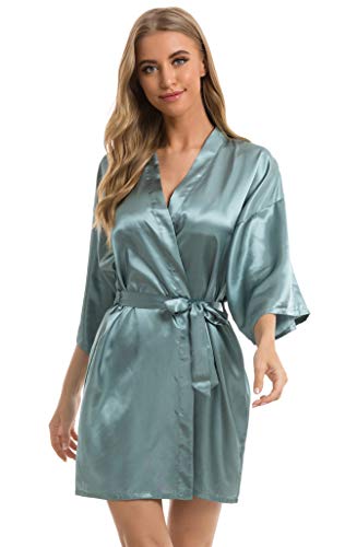 Vlazom Kimono för damer, morgonrock, kort satin badrock med bälte, v-ringad kimono, Ljusgrön, S