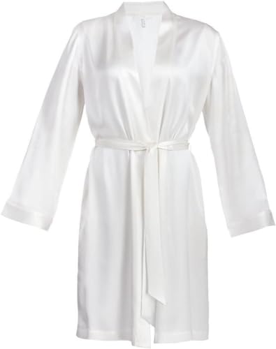 Vlazom Kimono för damer, morgonrock, kort satin badrock med bälte, v-ringad kimono, Vit, L