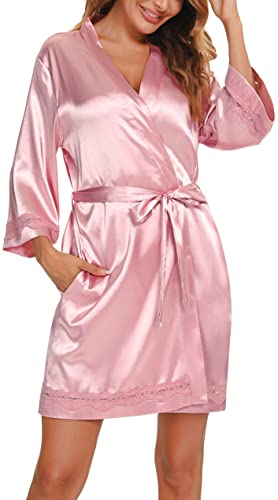 Vlazom Kimono för damer, morgonrock, kort satin badrock med bälte, v-ringad kimono, Ljusrosa, M