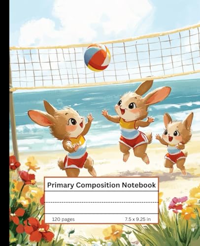 Primary Composition Notebook: Draw Journal for Grades K-2 Kindergarten | Dotted Midline and Picture Space | 120 Pages 7.5" x 9.25" | Cute Animals Playing Beach Ball