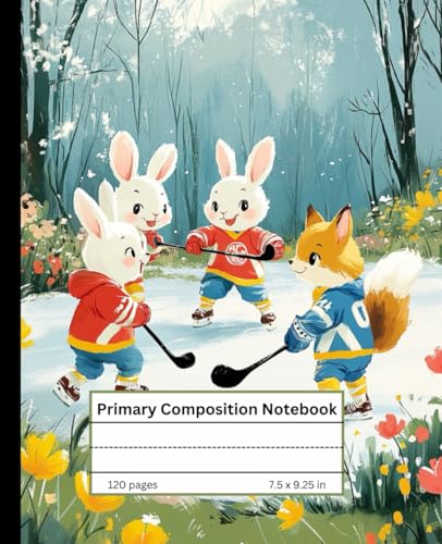 Primary Composition Notebook: Draw Journal for Grades K-2 Kindergarten | Dotted Midline and Picture Space | 120 Pages 7.5" x 9.25" | Cute Animals Playing Hockey
