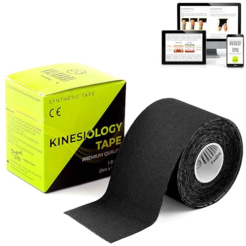 KALAHARI Professionell Kinesiologitejp plus E-bokapplikationer - Syntetisk Kinesiologiskt Tejp för bättre vidhäftning och ogenomtränglighet för vatten och svett- Kinesiology Tape (5cm x 5m) SVART