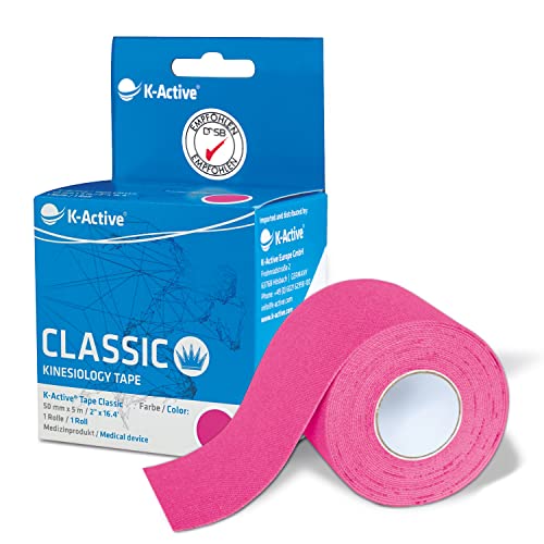 K-Active Tape Classic | Kinesiotejp superhudvänlig | vattentät | Kinesiologitejp för sport och terapi, extra lång stadga | [5 cm x 5 m] (rosa)