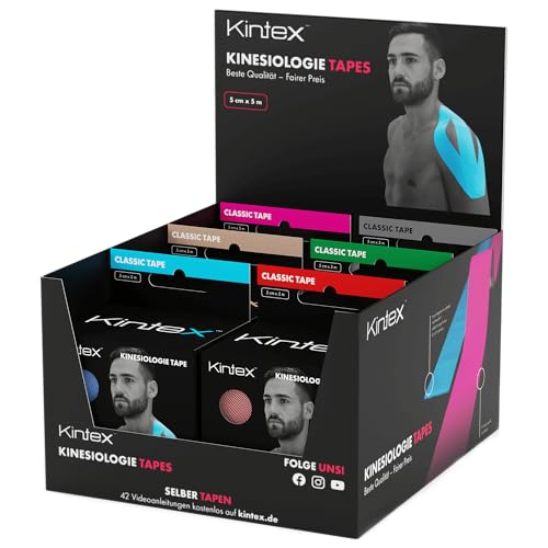 Kintex Kinesiologitejp Classic – självhäftande, elastisk, vattentät och antiallergisk – sport- och kinesiotejp för användning för sportskador – 6 rullar à 5 cm x 5 m