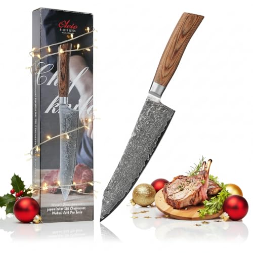 Wakoli Oribu 3 damaskknivar, kiritsuke-set – 11, 15, 20 cm blad av 67 lager damaskstål med AUS-10 kärna, olivträhandtag, presentförpackning – vass köksknivsats för kött, fisk, grönsaker