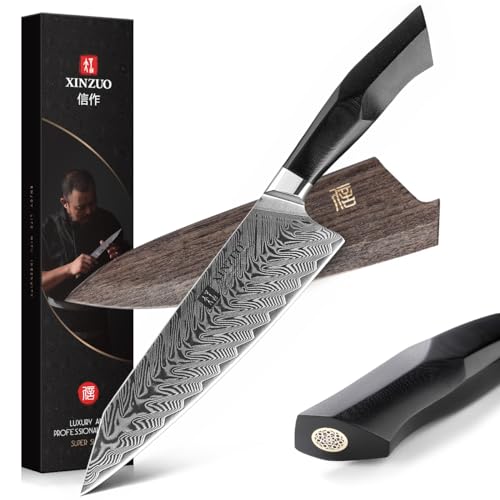 XINZUO Damaskus stålkockkniv, 8,5 tums Kiritsuke kökskniv Professionell smidd Gyuto matlagningskniv, militärklass G10-handtag med magnetisk mantel -Feng serien