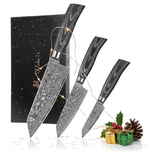 Wakoli EDIB Pro Black Premium 3-delars kiritsuke damaskusknivset med 9–17 cm blad, 67 lager äkta damaskusstål, ergonomiskt pakkaträhandtag och trälåda – exklusivt japanskt köksknivset