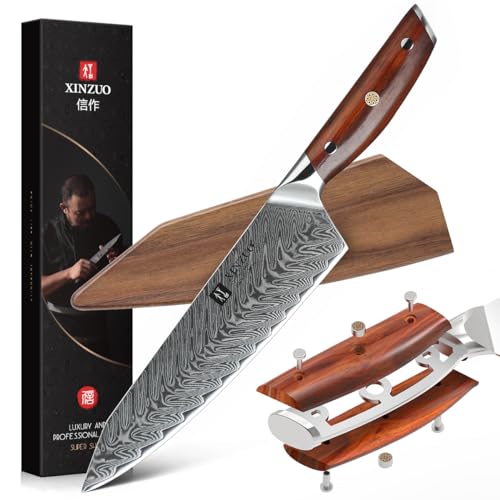 XINZUO Damaskustål 21.5 cm kockkniv, handsmidd Kiritsuke kockkniv Professionell japansk kökskniv ökenjärnvedhandtag med svart valnötmantel och akaciaträslåda