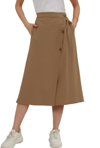CHARTOU Dam sommar linne elastisk rygg knapp swing midi A linje kjol, Khaki, M
