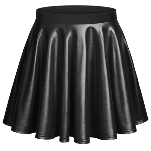 Aomig Kvinnor glänsande flytande metall minikjol kort utsvängd plisserad kjol, A-linje metallisk minikjol, karneval prestanda hög midja cosplay party (svart-M)