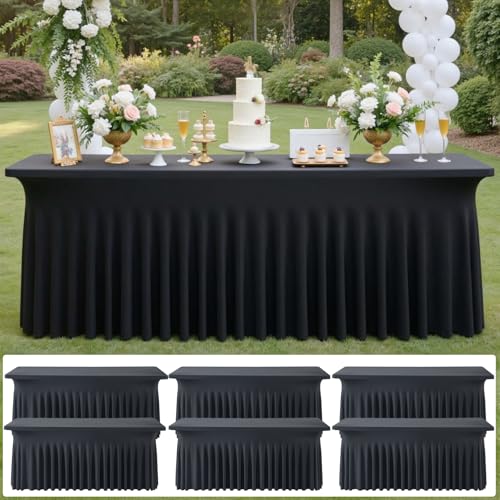 6-pack svart spandex bordsduk för 180 cm rektangulära bord, veckfri stretch bordsduk med kjol för bankett party bröllop födelsedag möte display dekoration bordsdukar