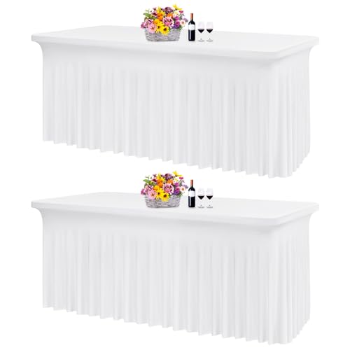2-pack vit bordskjol i spandex för 1,8 m rektangulära bord, skrynkelbeständig monterad spandex bordsduk bordsskydd stretch bordsduk med kjol för bröllop banketter mässa, festevenemang
