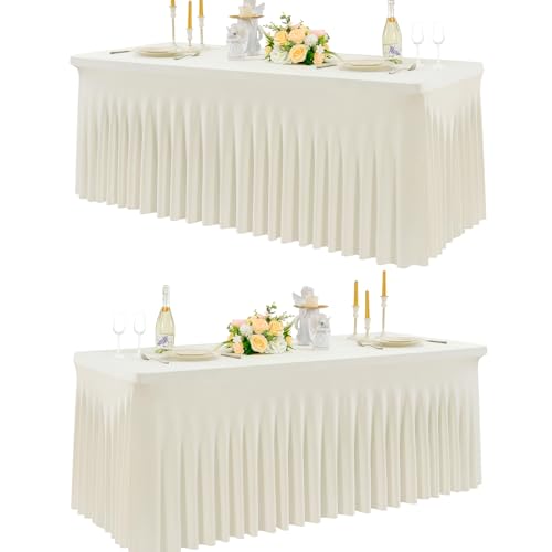NSSONBEN 2-pack elfenben spandex bordsduk för 180 cm rektangulära bord, veckfri stretch bordsduk med kjol för bankett fest bröllop födelsedag möte display dekoration bordsdukar