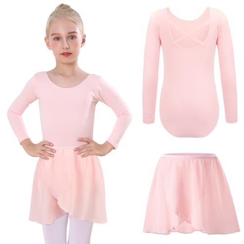 Bezioner baletttrikåer för flickor med avtagbar kjol balettklänning outfit långärmad dans trikåer ballerina kostym för flickor, Rosa, 140