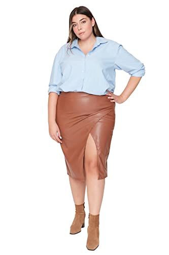 TRENDYOL Dam stora storlekar midi pennkjol pennkjol tyg plus size kjol, BRUN, 52 stor