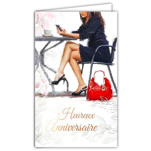 15-6521 Grattis på födelsedagskort för vacker ung aktiv kvinna som dricker kaffe på terrassen handväska klackskor smartphone rosa röd "We love you" - tillverkad i Europa