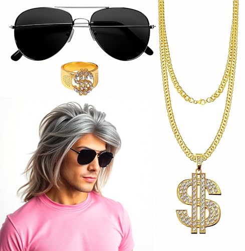 TK grupp Timo lingler karneval kostym set vuxna Vokuhila Assi peruk 80-talet 90-talet kläder kostym med glasögon pilotglasögon guldkedja ring guld dollar