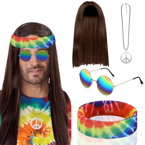 Hippie kostym herr dam set – 60-talet 70-talet 80-talet outfit män hippie accessoarer kläder med t-shirt hippie glasögon peace kedja peruk pannband, disco hippie kläder karneval, Mångfärgad, XL