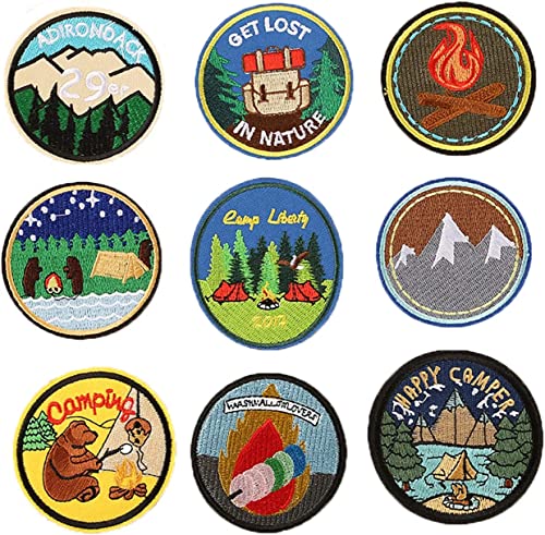 CYWQ 9 st utomhus rund husbil strykjärn på lappar personlig resa camping björn gå vilse i naturen berg broderad applikation för gör-det-själv-jeans, jacka, kläder, väska
