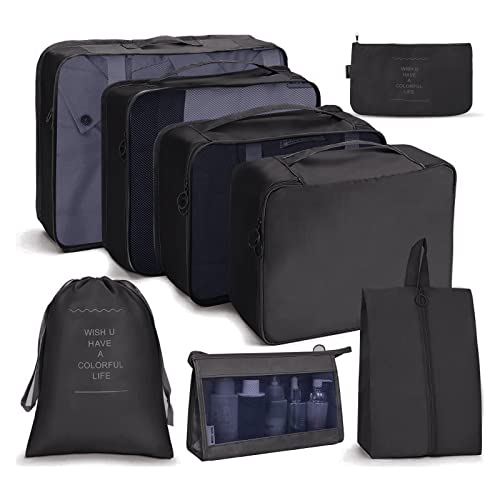 OSDUE Packing Cubes, 8 Sts Researrangör Packpåsar, Resbagagepaketering, Vattentät Resevaror Väska Kläder Skor Kosmetika Toalettartiklar Förvaringsväskor (Svarta)