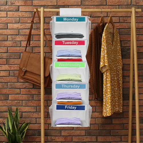 Veckovis klädförvaring för barn 5 hyllor veckodag barnkläder hängande hylla måndag till fredag dagliga kläder garderob förvaring för hattar t-tröjor väskor handdukar (vit)