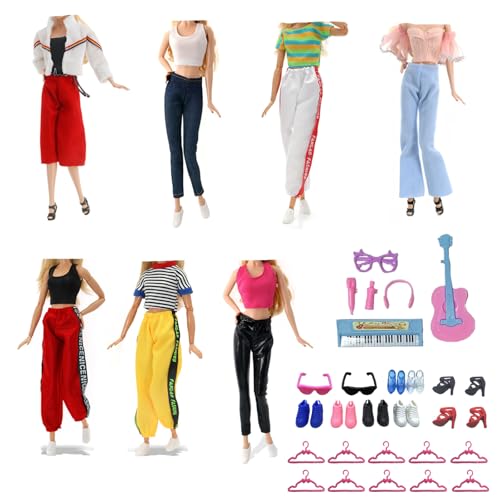 Kläder För Barbie-dockor, inklusive mode 6 toppar 6 byxor 10 klädgalgar 6 par fritidsskor 6 musiktillbehör 1 kallt glas i slumpmässig ordning för 30 cm dockor