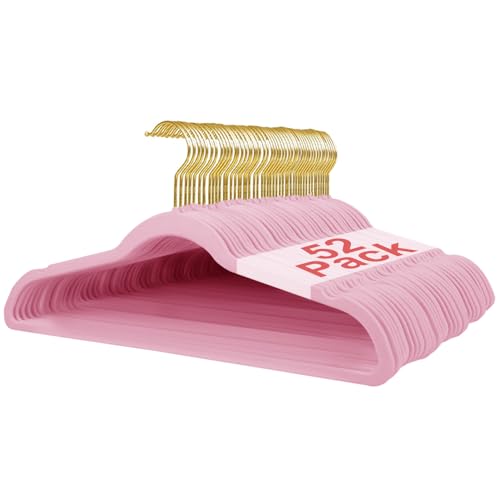 Wellong 52 stycken sammetshängare, klädhängare för vuxna 45 cm, halkfria hängare med skåror på axeln, platsbesparande för kläder, mörkrosa(guld bredd)
