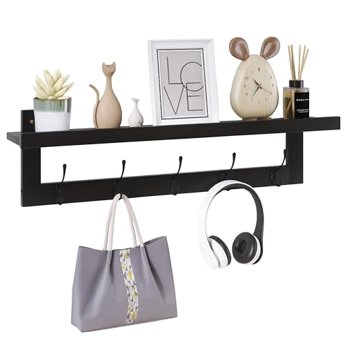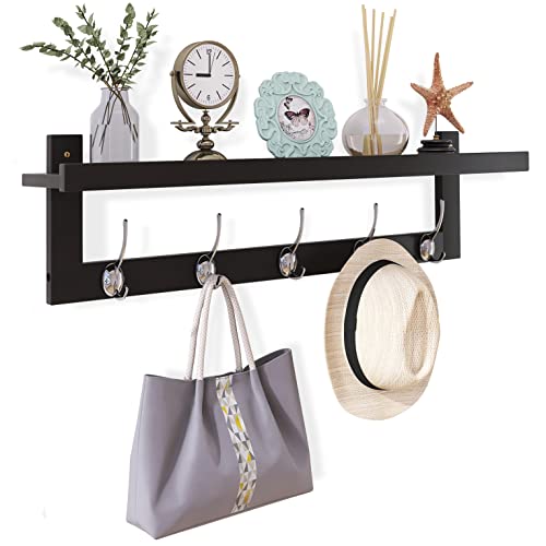 SMIBUY Klädkrokar med hylla väggmonterad, 74 cm entré klädhängare för vägg, bambu hängande hylla med 5 dubbla metallkrokar för badrum, sovrum, kök, vardagsrum, lera (svart)