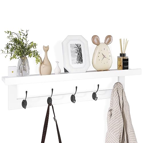SMIBUY Klädkrokar med hylla Väggmonterad, 74 cm Entré Klädhängare för vägg, Bambu Hängande Hylla med 5 Dubbla Metallkrokar för Badrum, Sovrum, Kök, Vardagsrum, Lerrum (Vit)