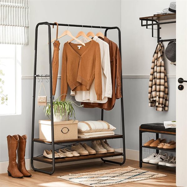 Klädställning i metall med 2 hyllor i trä – Rustik brun/svart