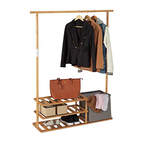 Relaxdays Klädstativ med skoställ, 4 klädkrokar, hylla, bambu och MDF, HWD 150 x 70,5 x 30 cm, naturvit