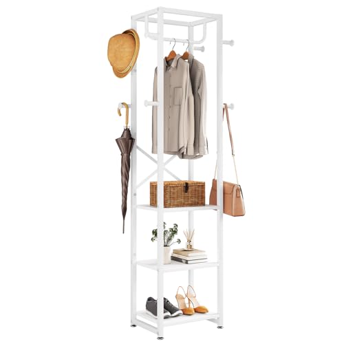 IBUYKE Klädställ, fristående klädstativ med 3 hyllor och 8 krokar, industriellt klädstativ för entré, hall, sovrum, 180 x 40 x 30 cm, vit TMJ088W