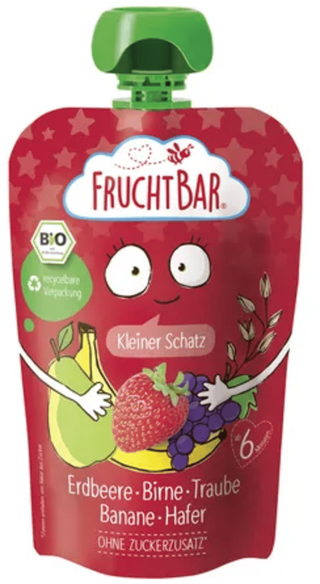 FRUCHTBAR Klämmisar Jordgubbar-Päron-Druvor-Banan-Havre Ekologisk - 100 g