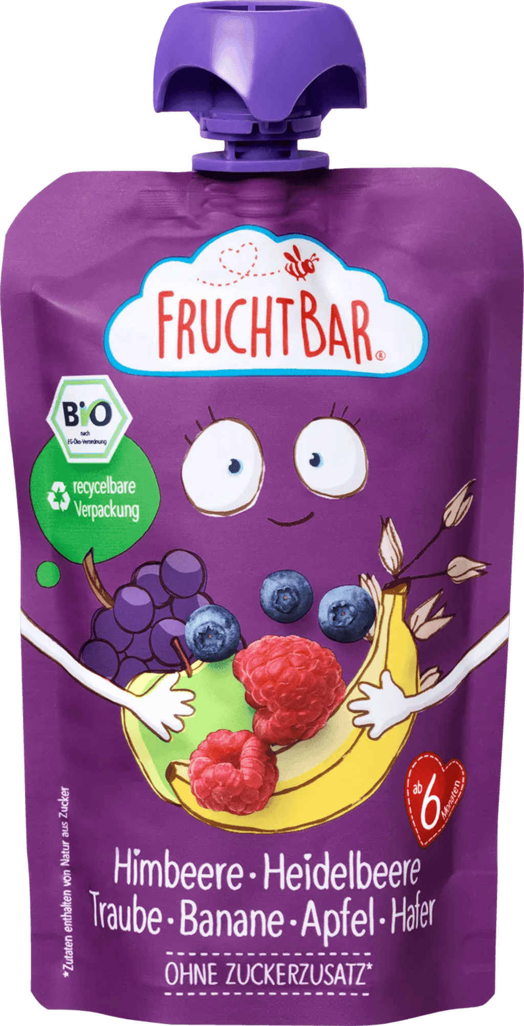 FRUCHTBAR Klämmisar Hallon-Blåbär-Druva-Banan-Äpple-Havre Ekologisk - 100 g