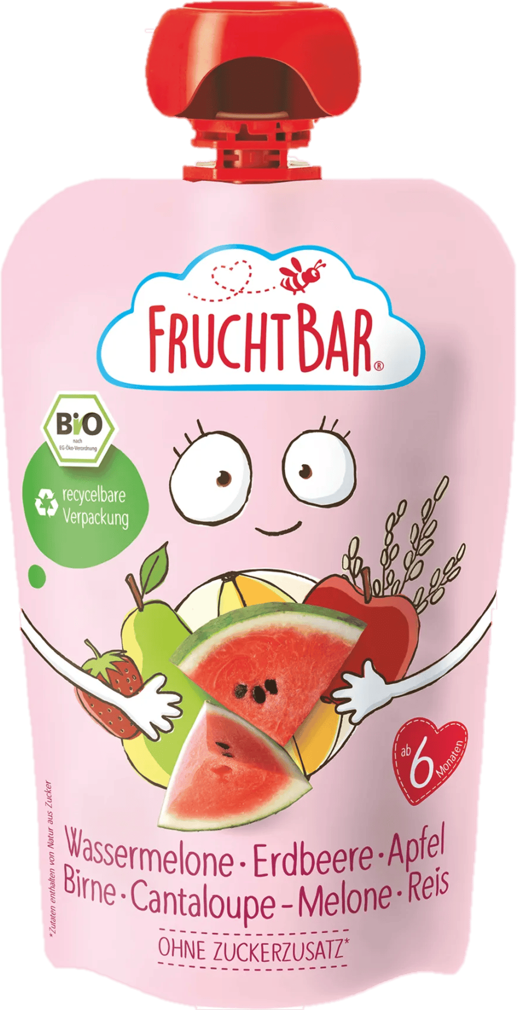 FRUCHTBAR Klämmisar Vattenmelon-Jordgubb-Äpple-Päron-Melon-Ris Ekologisk - 100 g