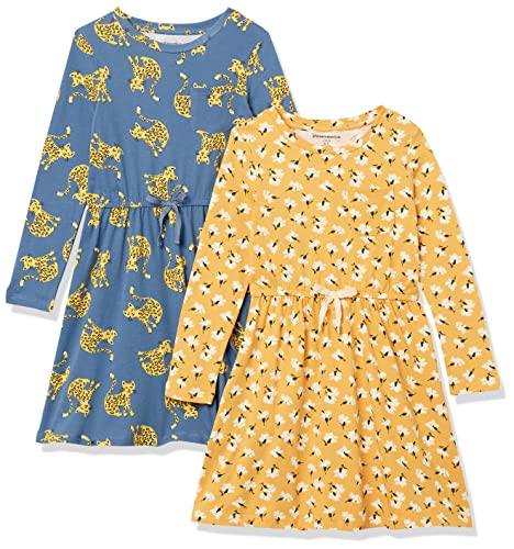 Amazon Essentials Småbarn flickor långärmad elastisk midja t-shirt klänning, blå katt/gul blommig, 4T