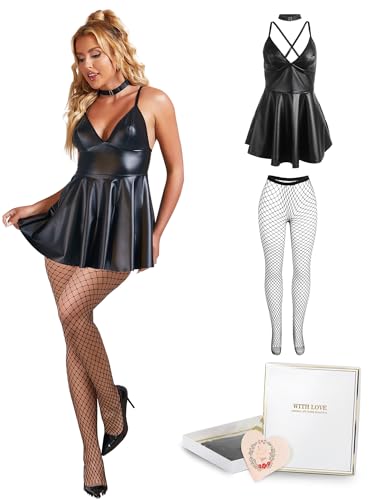 ohmydear Läderklänning damer sexig kort babydoll läder underkläder damer A-linje klubbkläder sexig outfit för kvinnor curvy underkläder PU-läder klänning för fest, svart, L