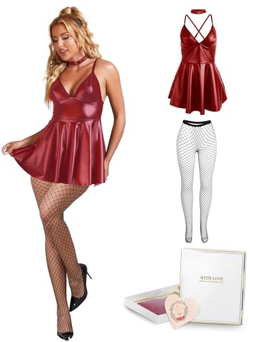 comeondear Kvinnor Sexig Klänning PU Läder Stor Storlek Ärmlös Varm Underkläder för Kvinnor Babydol V-Neck Mini Rygglösa Sommarpartyklänningar Underkläder Wetlook Halter Clubwear, Röd + strumpor, S