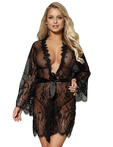 Kvinnor Kimono Plus Size Morgonrockar Klänning Kort spetsklänning med bälte och string för flickvännen Elegant pyjamas(Svartb,M-L)