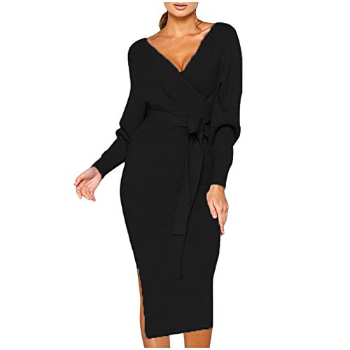 Stickade klänningar för kvinnor vinter långa tröjklänningar kvinnor elegant enfärgad V-ringad hög midja smal passform figurnära klänning med bälte lång tröja ledig klädsel festklänning, svart, XL