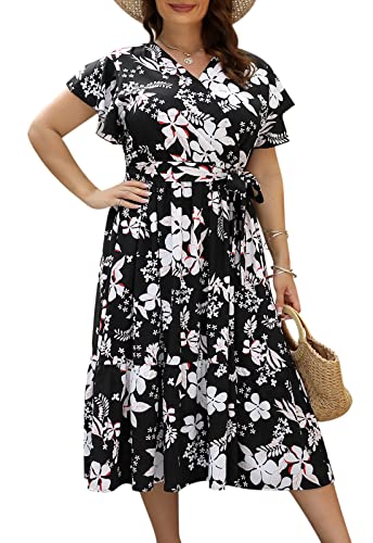 GRECERELLE Damklänningar sommar vardaglig kortärmad v-ringad skiftklänning för kvinnor damer t-shirt klänning med fickor, Svart med anemonblomma, XL